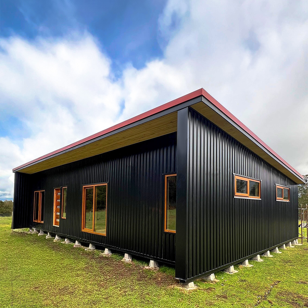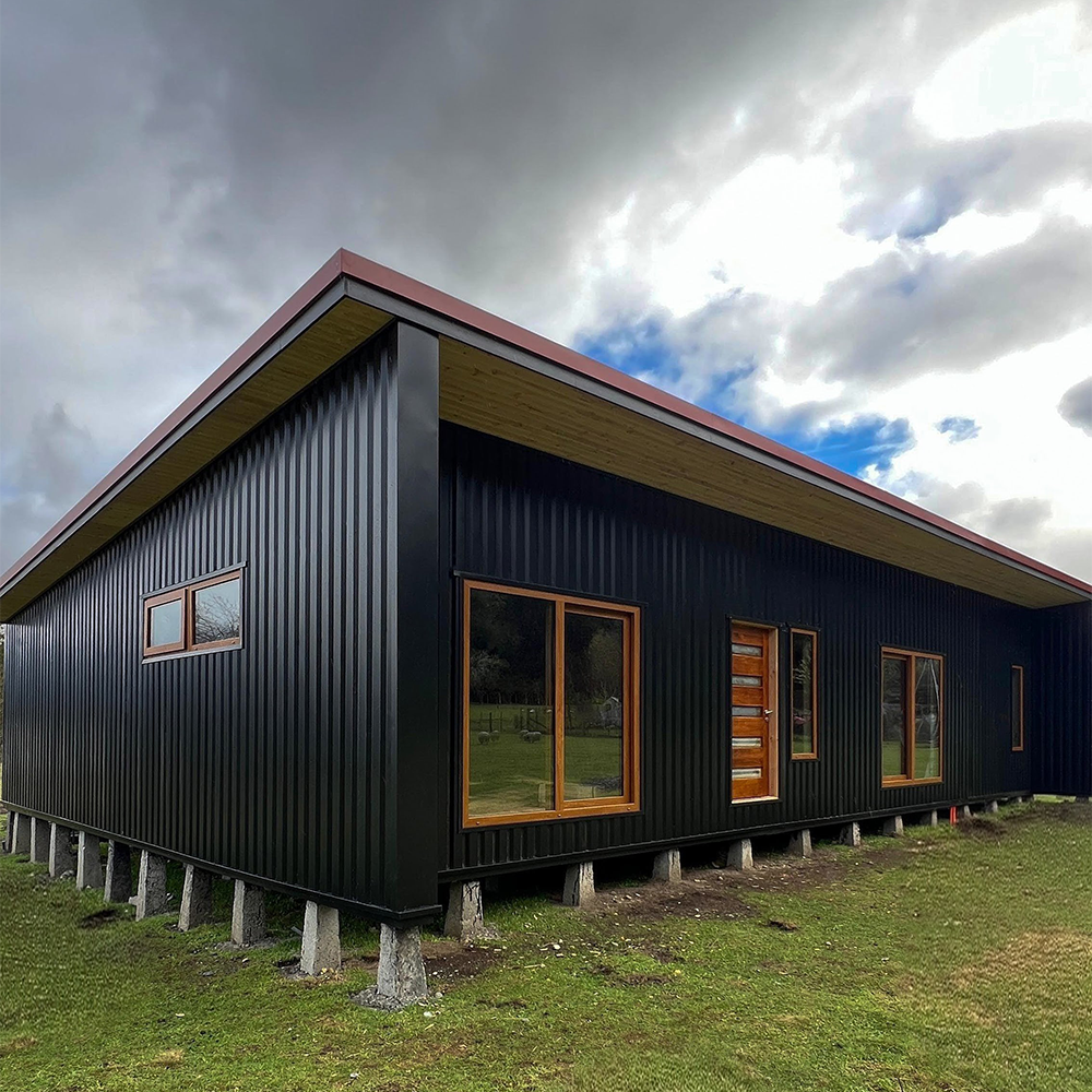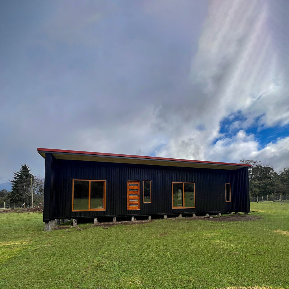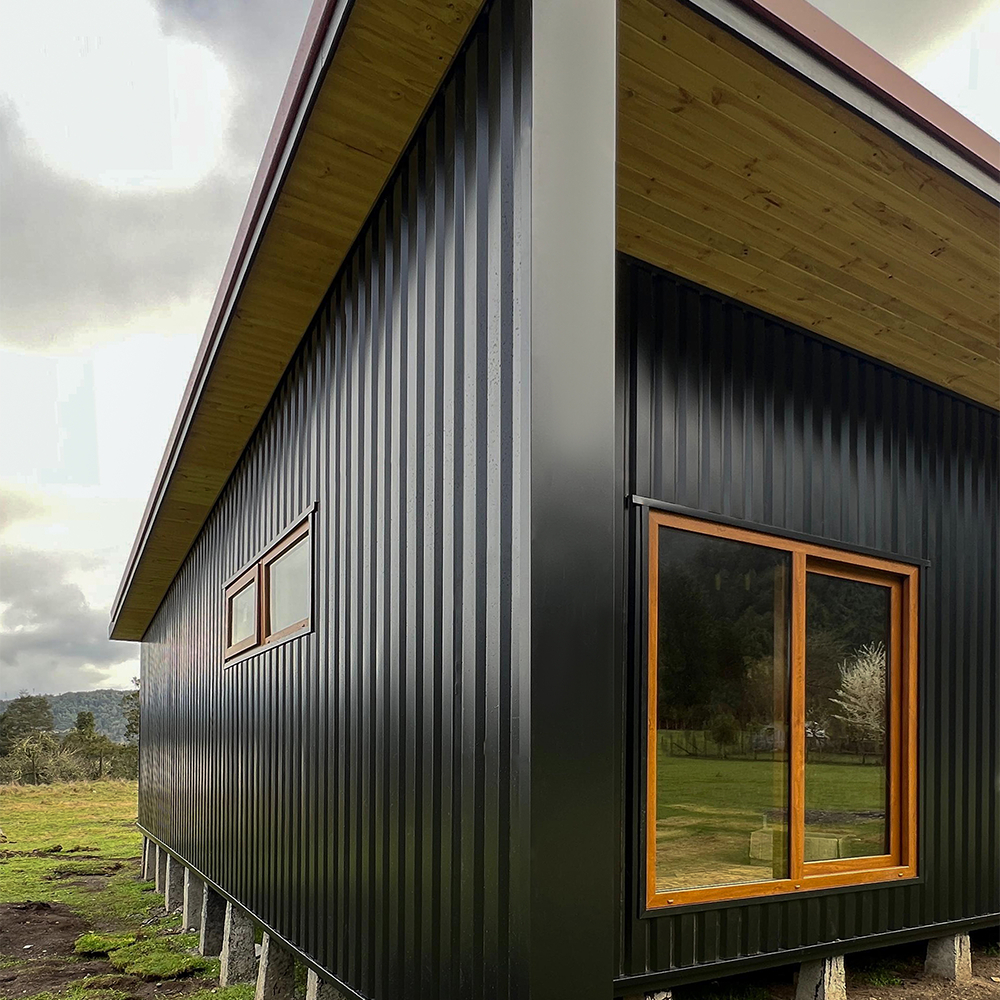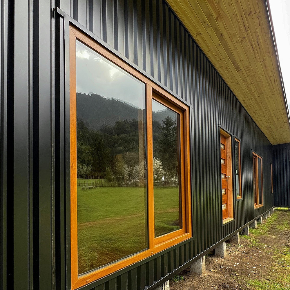 Este proyecto en Puerto Varas destaca por su diseño moderno y cálido, donde nuestras ventanas termopanel de PVC color nogal aportan contraste y elegancia frente al revestimiento exterior oscuro.